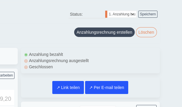 Hier findest du alle angenommenen Angebote deiner Kunden. Mit einem Klick wird daraus eine Rechnung. Du kannst Anzahlungen einfordern und Anzahlungsrechnungen direkt aus dem Auftrag erstellen - die Anzahlung wird bei der Endrechnung automatisch berücksichtigt.