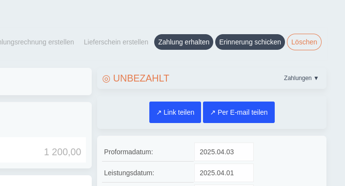 Schick deinen Kunden erst eine Proformarechnung. Nach Zahlungseingang erstellst du die echte Rechnung mit einem Klick. Zahlt der Kunde nicht? Einfach löschen. Verfügbar in 8 Sprachen.