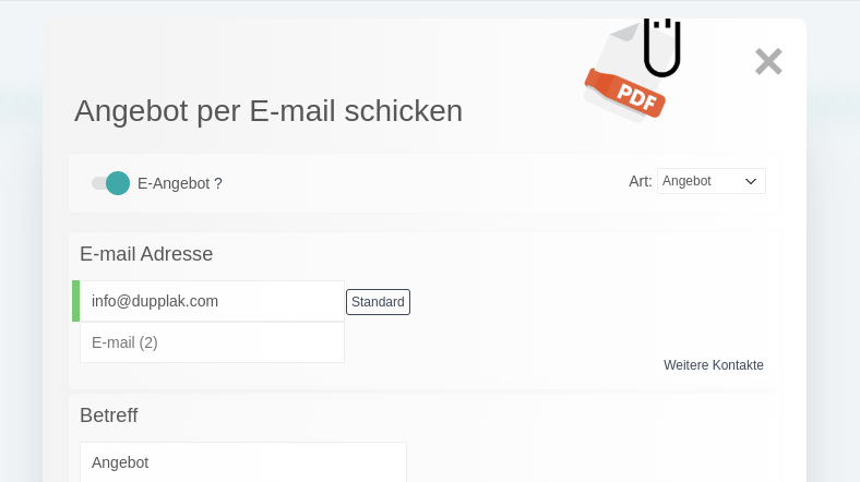 Versende Angebote an deine Kunden - papierbasiert oder per E-Mail. Bei E-Angeboten kann dein Kunde direkt in der E-Mail annehmen oder ablehnen. Angenommene Angebote wandern automatisch zu den Kundenaufträgen, abgelehnte kannst du einfach löschen. Funktioniert in mehreren Sprachen.