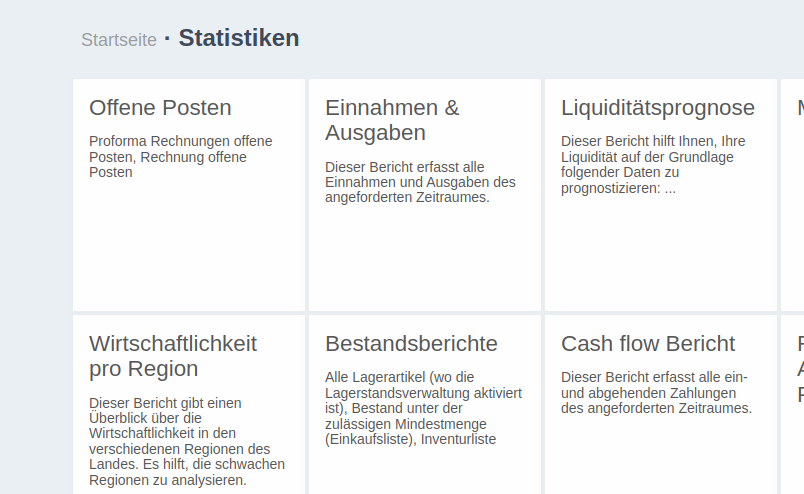 Dir stehen 10 Auswertungen zur Verfügung: Cash-Flow, Projekt-Cash-Flow, Forderungen, Ausgabenstatistik, Liquiditätsplanung, Kundenzahlungsverhalten, Kundendokumente, Kundenabgleich, MwSt.-Analyse und Bestandsstatistik. So behältst du den Überblick und kannst fundierte Geschäftsentscheidungen treffen.